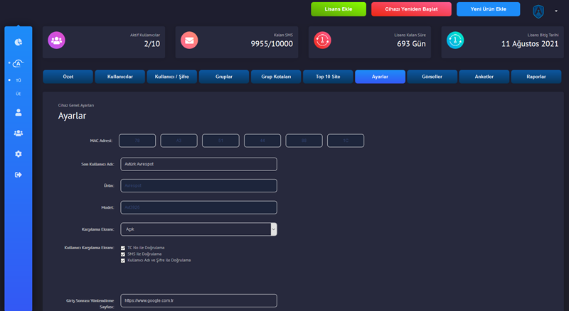İsteğe bağlı olarak hotspot giriş ekranında T.C.K.N veya diğer kinlik doğrulama yöntemleri kullanılarak giriş yapılabilme seçeneğine sahiptir.