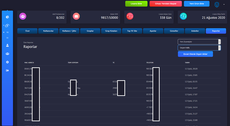 Raporlar sekmesinde birçok başlıkta rapor görüntüleyebilir ve excel çıktısı alabilirsiniz